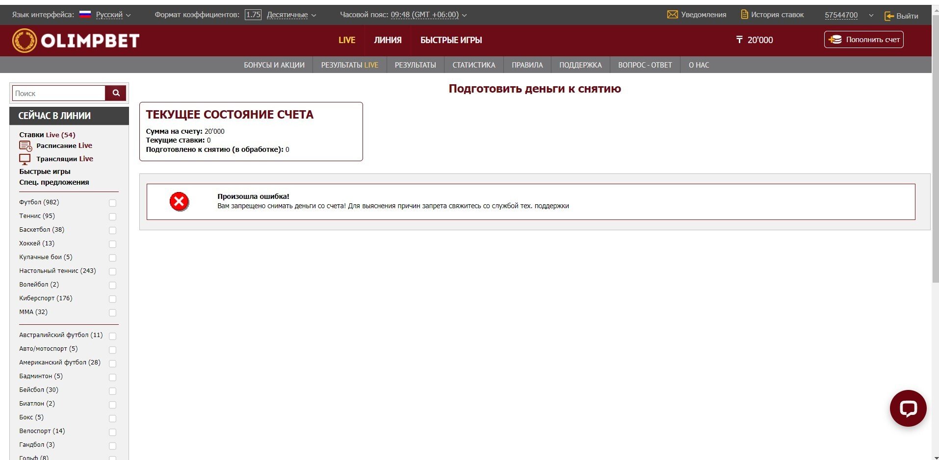 ребята здравствуйте, эти уроды из олимпбет сделали перерасчет моих 2 ставок на сумму 25000т, ребята клянусь сставка сделано правильно, даже при ставке поставила галочку на принимать с любыми тоталами и кф, нажимала при 131,5 меньше приняли с 129,5 меньше, не каких ощибок не была, если я вру то эти деньги пусть уйдут на лекарство моих детей если они то на их, они перерасчет сделали через 8 часов как только поставила на вывод, как поставила на вывод через 4 минут сразу возвраты пошли, эти нечесты думаете проверили даже ставки, просто на угад дали возвраты так как логин ушел в плюс вот и все, прошу решить данный вопрос так как я в своих ставках на 100% уверена