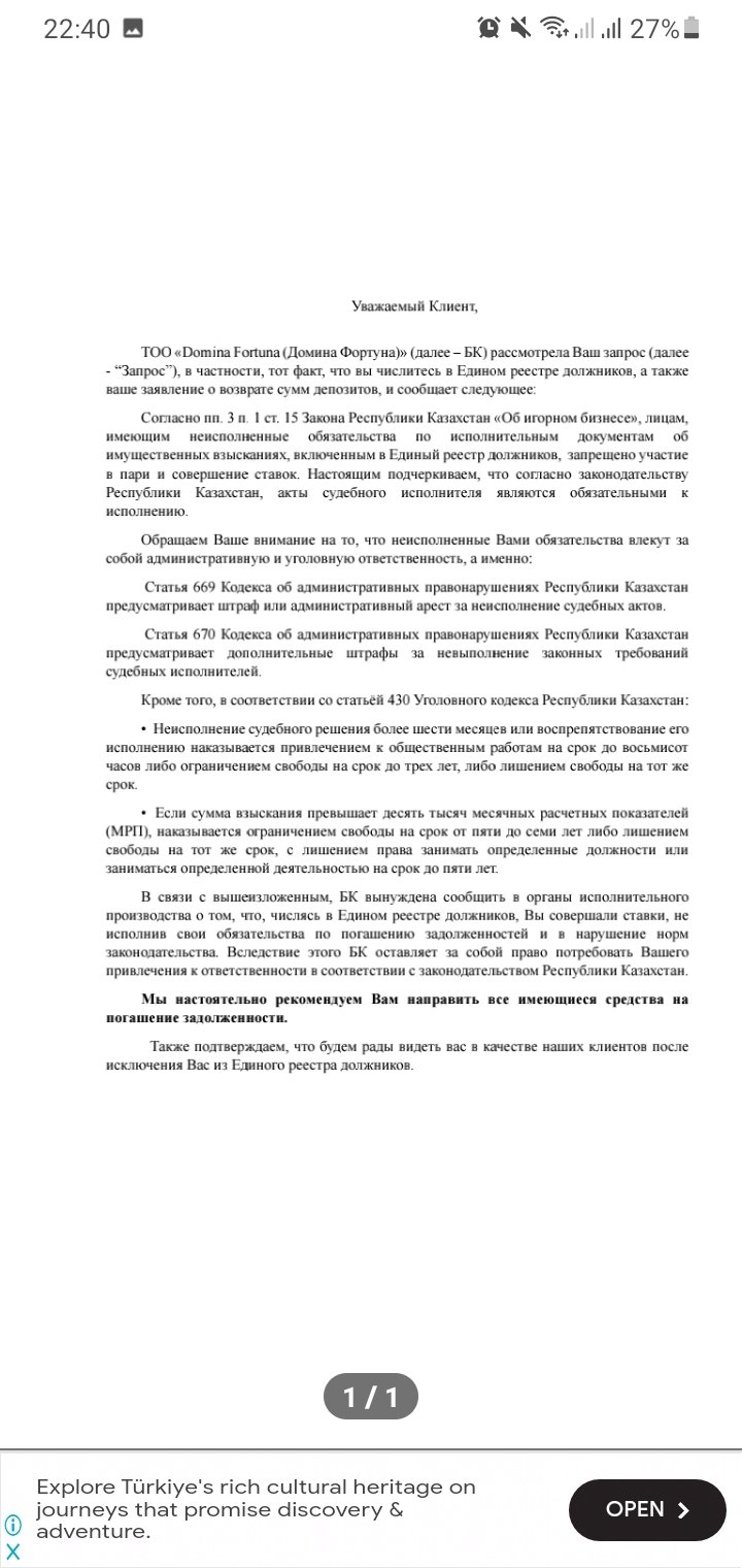 Я числюсь в реестре должников (номер телефона зарегистрированная в БК +77757987112) Аитбаев Наурыз Нуртазауоы, требую вернуть сумму (90000тг) депозита с г. Статья 157 Гражданского кодекса РК: Договор, заключенный с нарушением закона, может быть признан недействительным, если контора принимает ставки от лиц, которым это запрещено законом. 2. Статья 23 Закона РК «О лотереях и лотерейной деятельности»: С 9 сентября 2024 года букмекерские конторы обязаны не принимать ставки от лиц, находящихся в реестре должников. Прием таких ставок противоречит этому закону. 3. Статья 8 Закона РК «О защите прав потребителей»: Потребитель имеет право на получение качественных услуг в соответствии с законодательством. Прием незаконных депозитов и отказ в их возврате нарушает права потребителя. Эти статьи регулируют деятельность букмекерских контор и права граждан в Казахстане. Букмекер не хочет возвращать средства и ответили мне на почту так что якобы я сам виноват в образовавшейся задолженности. Мои проблемы с долгами не касаются Букмекера. Согласно вышеперечисленным законам, букмекер обязан выплатить мне последний депозит внесенный уже будучи в реестре должников