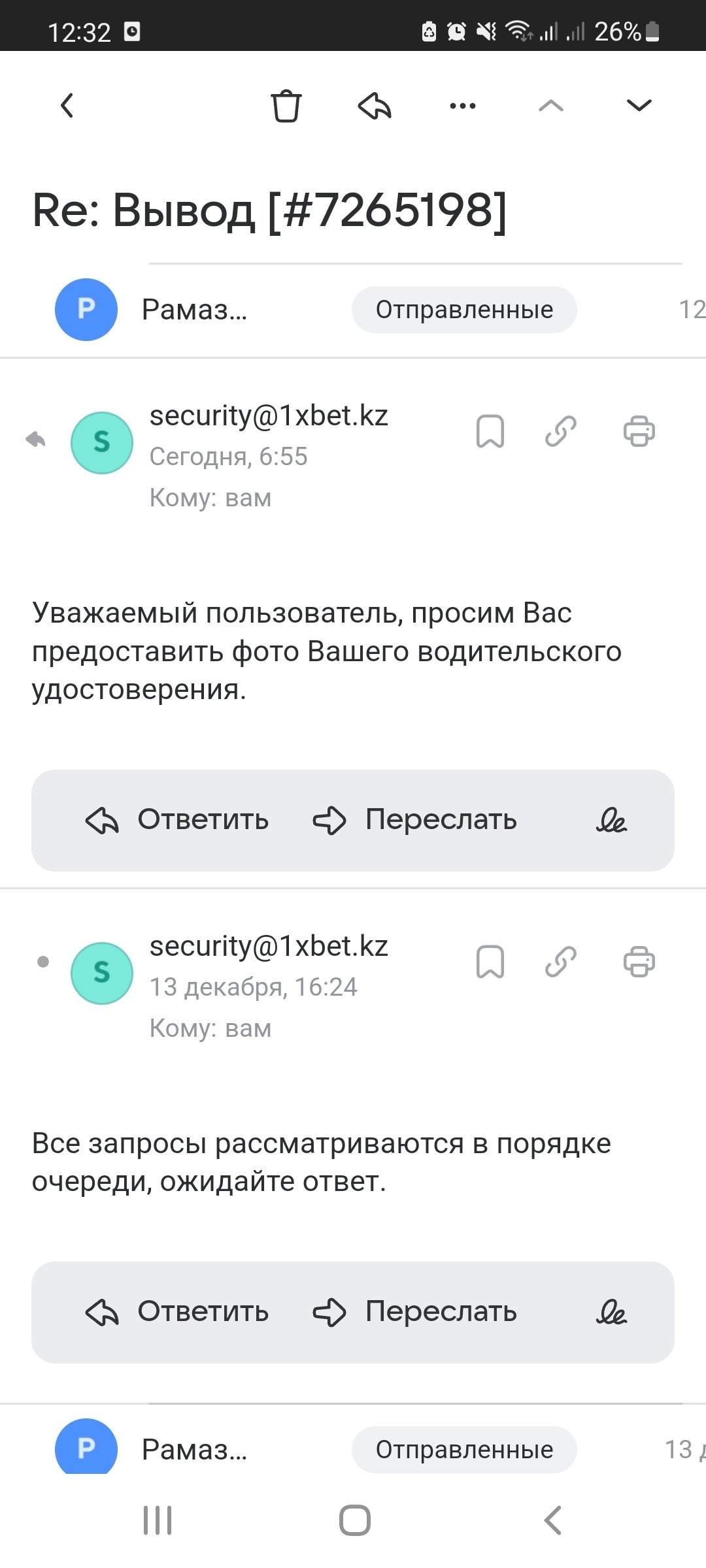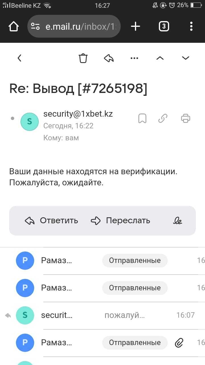 Доброй ночи! Блокировка вывода средств-верификация. У службы безопасности возникли ко мне вопросы, касательно моего акаунта и счета прикрепленного к нему. Хорошо, я восприняла это положительно так как люди работают над безопасностью и сохранностью средств, пользователей их приложения! Все запрашиваемые документы я предоставила в срок и должном порядке (паспорт, справку с банка, фото паспорта на белом листе с указанием даты), но потом началось откровенно говоря издевательство. Запросили моё фото и рядом должна быть моя переписка и мой паспорт. Для этой унизительно и не простой процедуры мне пришлось просит третьих лиц. Хорошо я сделала все как они просили. Но теперь они просят (Отправьте запрошенные файлы через полную версию Вашего сайта электронной почты. Убедитесь, что размер отправляемого файла превышает 1 МБ). Я конечно все понимаю, но такие действия становятся похоже на мошенничество и вызывают ощущения какого то развода! Кто подбирает таких умников на работу в 1хбет хотела бы я увидеть их воочию! Помогите мне или подскажите как быть в этом бесконечном хамстве?
