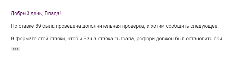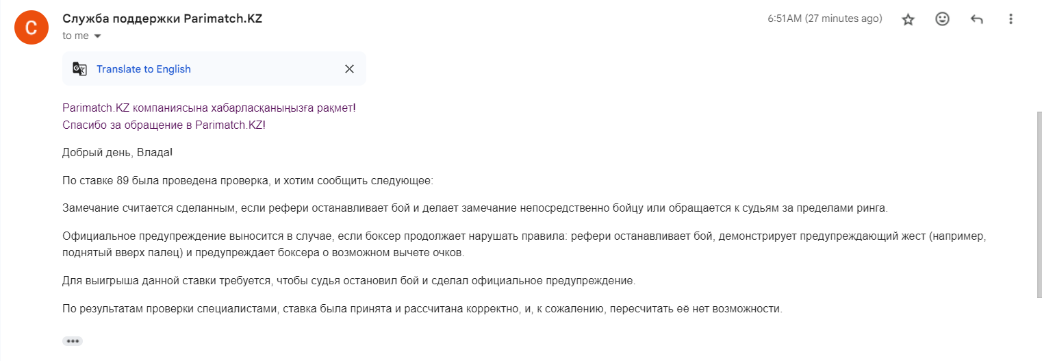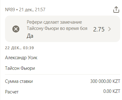 До начала матча "Усик - Фьюри 2" совершила раздельные пари на то, что будут замечания от рефери и Усику, и Фьюри. С Усиком ставка рассчитана проигрышем вроде как верно, а про Фьюри я не согласна. Точная формулировка ставки: "Рефери сделает замечание Тайсону Фьюри во время боя" Давайте разберёмся для начала, что такое "замечание от рефери к боксёру", обратимся к первоисточнику: Если боксер не выполняет указаний рефери, нарушает Правила, проявляет неспортивное поведение, то он, по усмотрению рефери, может быть наказан замечанием, предупреждением или дисквалификацией. Замечание боксеру может быть вынесено как с остановкой, так и без остановки боя. В поединке же Фьюри были вынесены замечания в: 1) 5 раунде за удар по затылку без остановки 2) 8 раунд, обоюдное столкновение головами (по сути - замечание обоим), с остановкой 3) 8 раунд 1:13 до конца раунда, замечание Фьюри, с остановкой, легитимное, не оспоримое. 4) Ещё одно на 0:44 до конца 8 раунда. 5) 11 раунд 0:50 до конца. Тайсон Фьюри ударил ниже пояса, рефери дал жест, чтобы Фьюри не бил ниже. Без остановки. Суммарно 5 замечаний, одно из которых даже с остановкой поединка. Писала в чат поддержки ПариМатч, на что получила ответ: "Устные предупреждения не засчитываются, необходимо, чтобы сняли баллы за это". На снятие балла от какого либо бойца дают коэффициент 9-10 (может и больше), что уже несопоставимо с моими . А значит контора нагло врёт. Скриншот прикрепила. Прошу рассчитать корректно моё пари н89, ставка тенге, коэффициент , выигрыш тенге