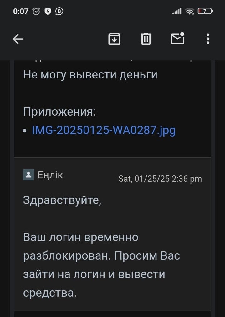 Получал такое же сообщение через почту, правда это было 25.11.2024. После этого не было никаких ответов. Просто зашёл через 3 дня к себе в приложение, и увидел, что там сумма лежит, которую я снял через час. Так что, попробуй зайти к себе и проверить, возможно, доступ восстановили и там деньги лежат уже.