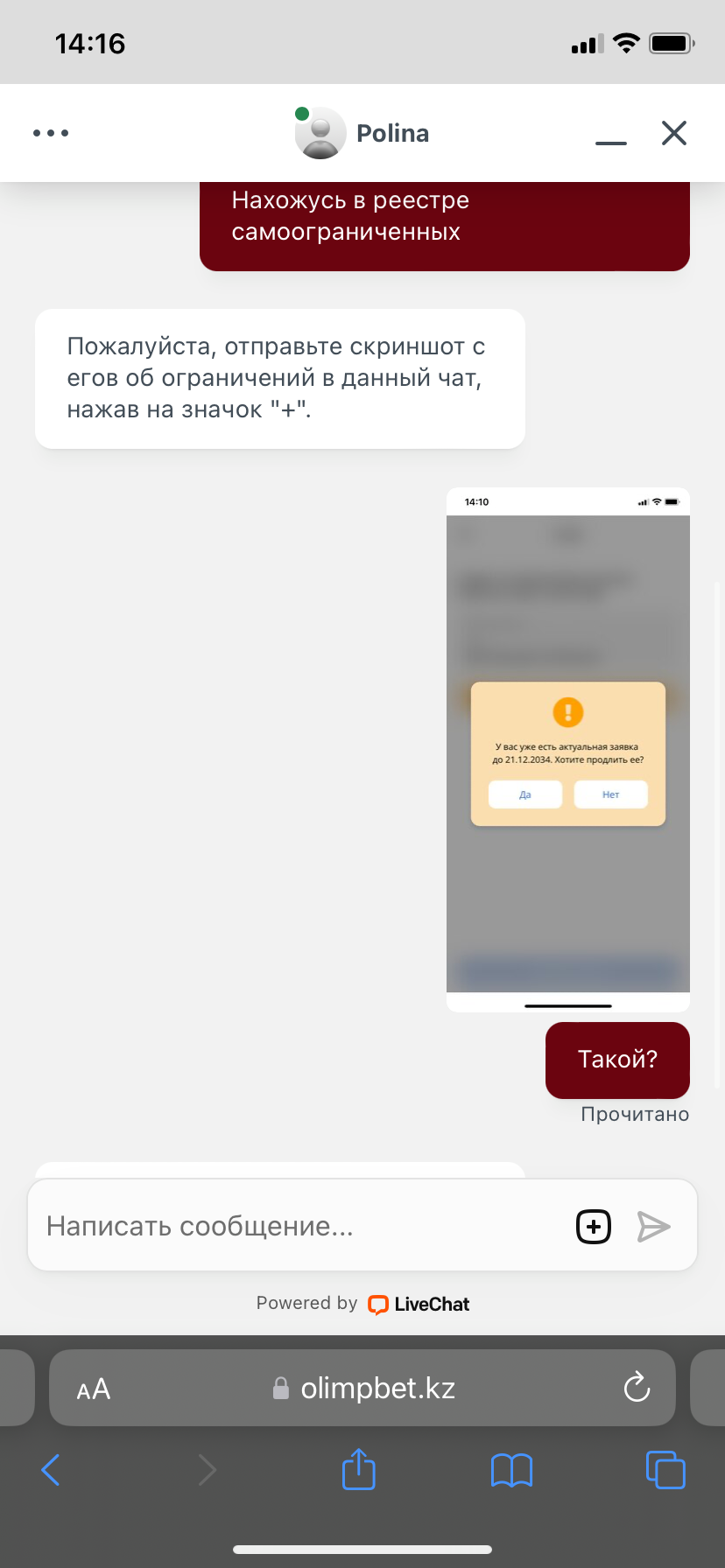 Жалоба №14325726: Проблема с программой самоограничений игрока