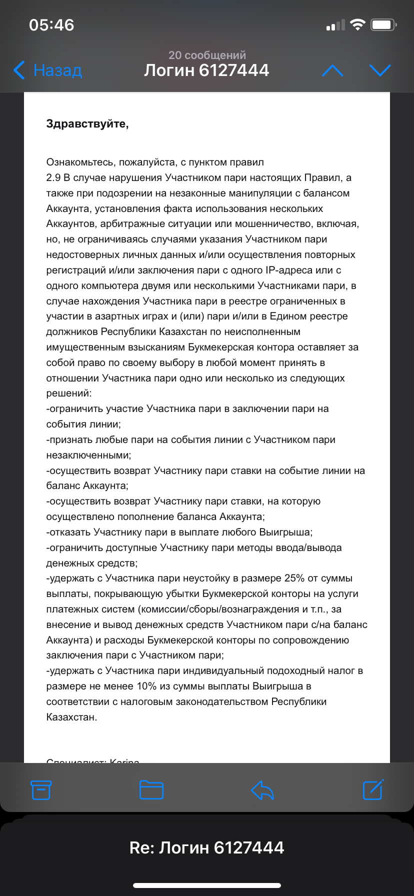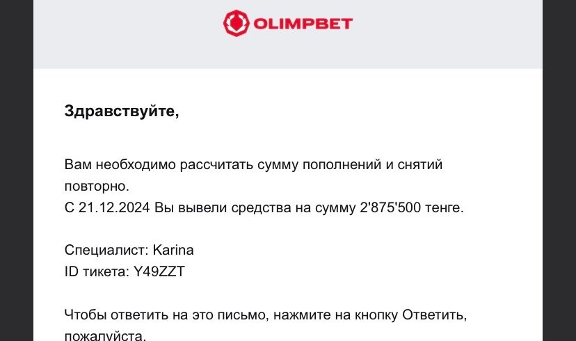 Здравствуйте, тоже само ограничили через егов мобаил месяц 1,5 назад, но бк Олимпбет принимает дальше ставки, как вернуть деньги? Куда написать? Чтобы хотя-бы вернули внесенные деньги