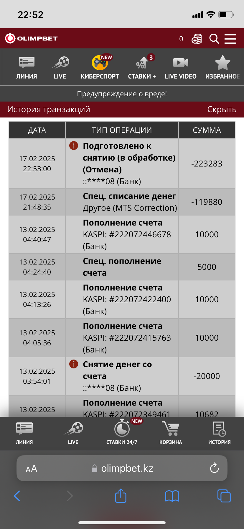Как вы написали посчитала вручную сумму снятие,а пополнениние счет олимпа автоматом рассчитано в каспи