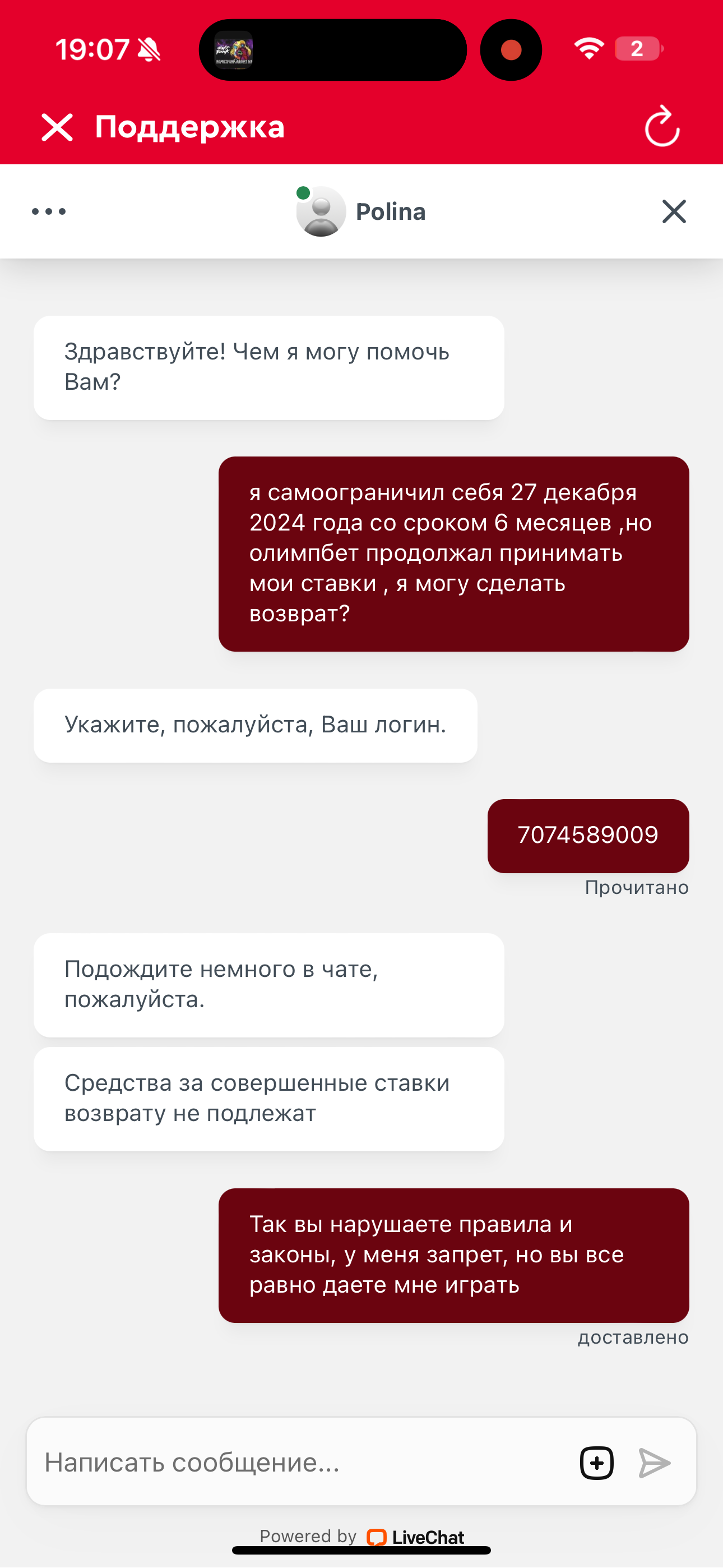 я самоограничил себя 27 декабря 2024 года со сроком 6 месяцев ,но олимпбет продолжал принимать мои ставки , я могу сделать возврат?