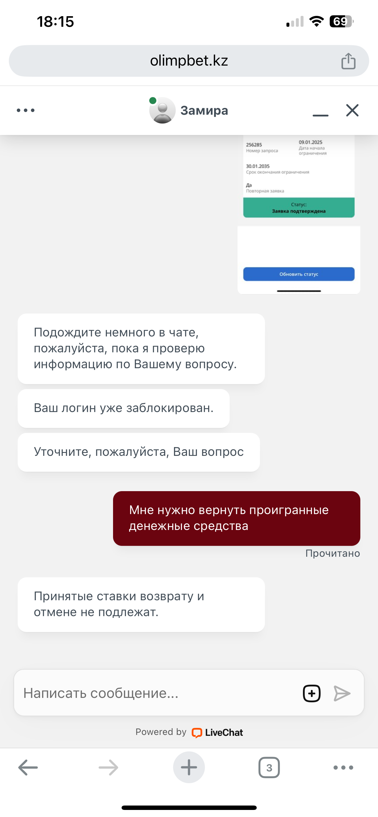 Я самоограничил себя 13 января 2025года со сроком 1,5 года. Но олимпбет открыл доступ и продолжал принимать мои ставки. Потом я 26 февраля 2025 года написал заявление что бы мне возвратили деньги так как я само ограничил себя но олимпбет продолжал принимать ставки. От них пришло письмо на почту что рассмотрение в течение 3-7 дней, но уже прошло почти 15 дней ответа нет. Можно как нибудь ускорить?