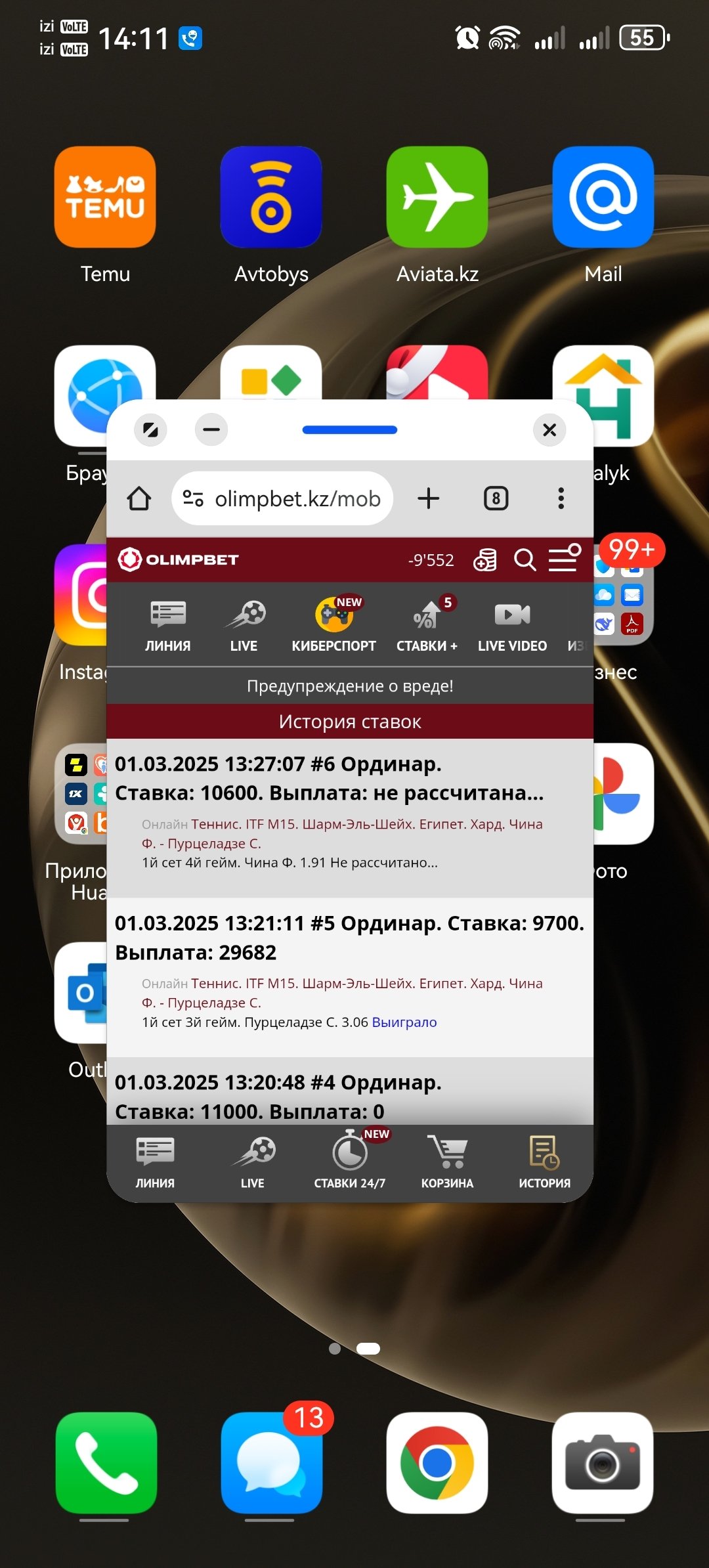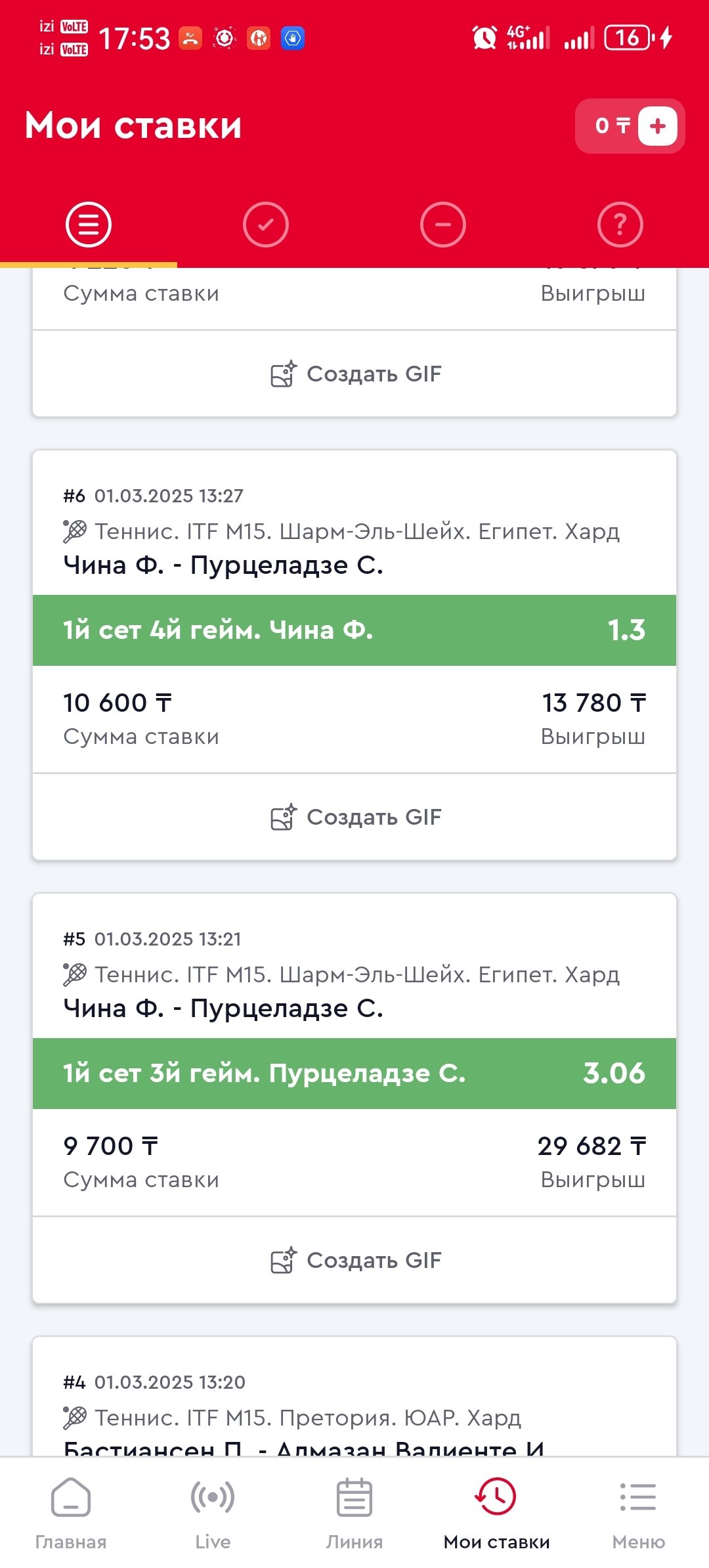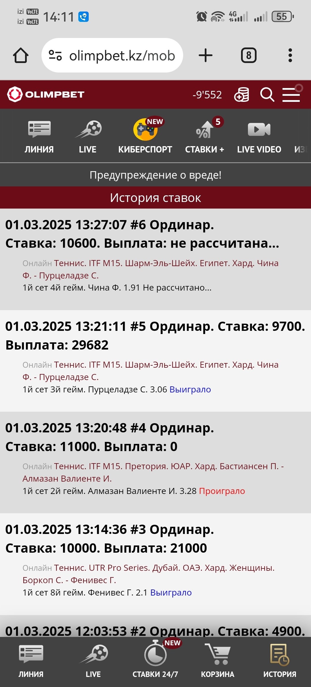 Логин 5417358, я ставил на 1.9 кф, но олимп после расчета ставки изменил кэф на 1,3. Еще удержали сумму, итоге дали 4228 тг, должен был 20 246 тг. Помогите с этим ситуаций, фиксированный кэф они изменили, также нельзя. Выйгрыш написана 13000 но на счету 4000 тг, но общ сумма 20 246 тг должен 13:27:07 #6 Ординар. Ставка: 10600. Выплата: 13780Онлайн Теннис. ITF M15. Шарм-Эль-Шейх. Египет. Хард. Чина Ф. - Пурцеладзе С. 1й сет 4й гейм. Чина Ф. 1.3 () Выиграло