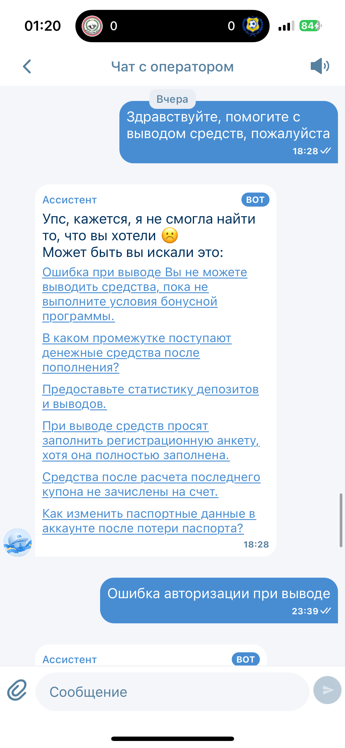 Дмитрий здравствуйте, уже 20 дней прошло с момента как букмекер запрошен после моего обращения. Я не могу сделать вывод деньги которые поступили по ЕРД. Ошибка авторизации. Почему они начислили если не дают вывод. У меня деньги поступили законно. Прошу дать мне вывод. 226211697 номер логина