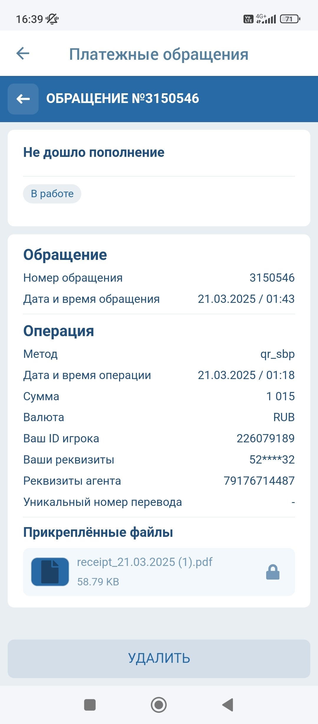 Третий депозит не зачислен! Обращение никто не рассматривает! Верните мои деньги! Люди не зактдывайте туда деньги они мошенники и жулики. Номер обращение 3230204,3150327,3150546 и прошлые депозиьы верните номер обращений написала. Ид 226079189. Помогите пожалуйста вернуть все депозиты. Суммы 529,1015,521