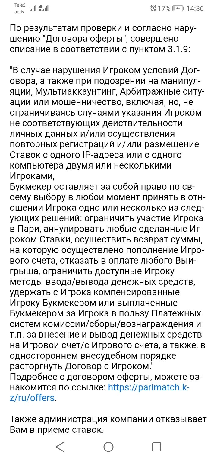 Арбитраж Легалбет получил комментарии и разъяснения от букмекера. Счет закрыт, а выигрыш аннулирован по решению СБ за нарушение правил . Открытому разглашению подробности нарушений не подлежат. Действия букмекера в рамках правил.