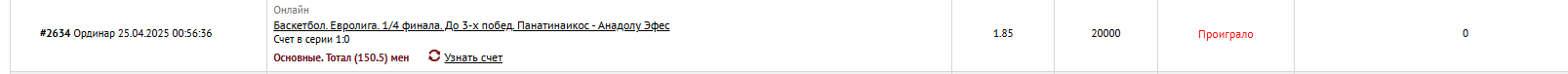 #2634 Ординар 00:56:36 сделал ставку на матч Панатинаикос - Анадолу Эфес у них завис тотал и не обновлялся до 31:12 в четверти и ставка принялась на неверный тотал