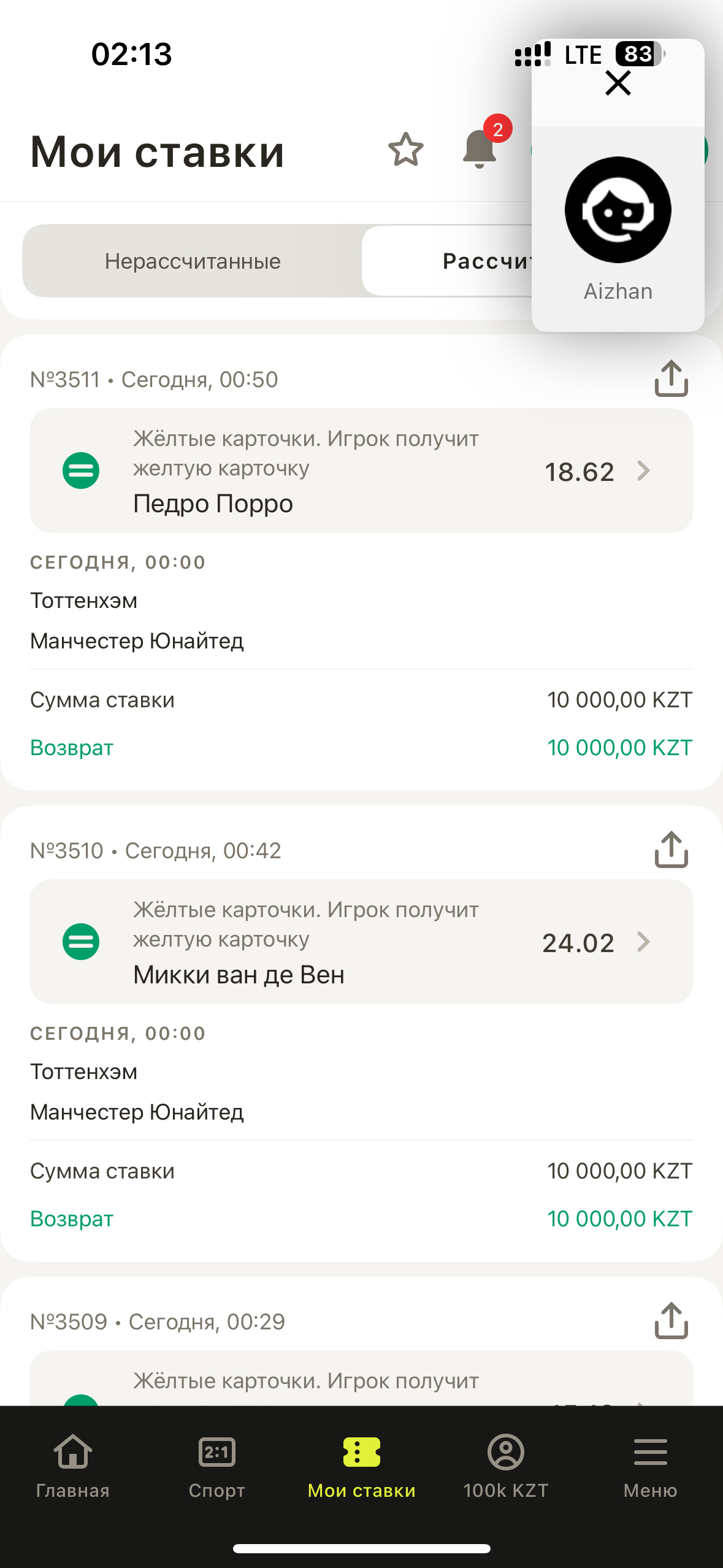 Сделал в лайв ставку (номер 3510) на матче ТОТ-МанЮ, одинарная ставка, что игрок Мики Ван де Вен получит ЖК, и ставка сыграла с коэф. 24. Букмекер принял такие три ставки на три разных игрока во время матча. Линия была и ставка была принята. Как только одна ставка сыграла, Букмекер сделал возврат ставок по ЖК, не рассчитав выигрышную ставку. На ответ они написали что техническая ошибка. Это не правильно - ставка была принята, сыграла. Таким образом они могут любую ставку в угоду себе сделать ошибочной. Прошу помочь правильно рассчитать ставку.