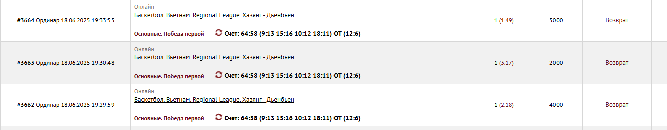 коэффиценты все предлагалось верно как в других бк, 1 ставка поставлена при счете 52-54, вторая ставка при 52-56, 3 ставка в 56-56 вроде, у них вдруг перед началом овертайма счет показывал на сайте 52-41, но коэффициенты обновлялись один в один как в 1хбет я смотрел там лайв трансляцию матча, как закончился матч они сделали возврат что коэффициенты были неверные, хотя у них один в один как в 1хбет все обновляется