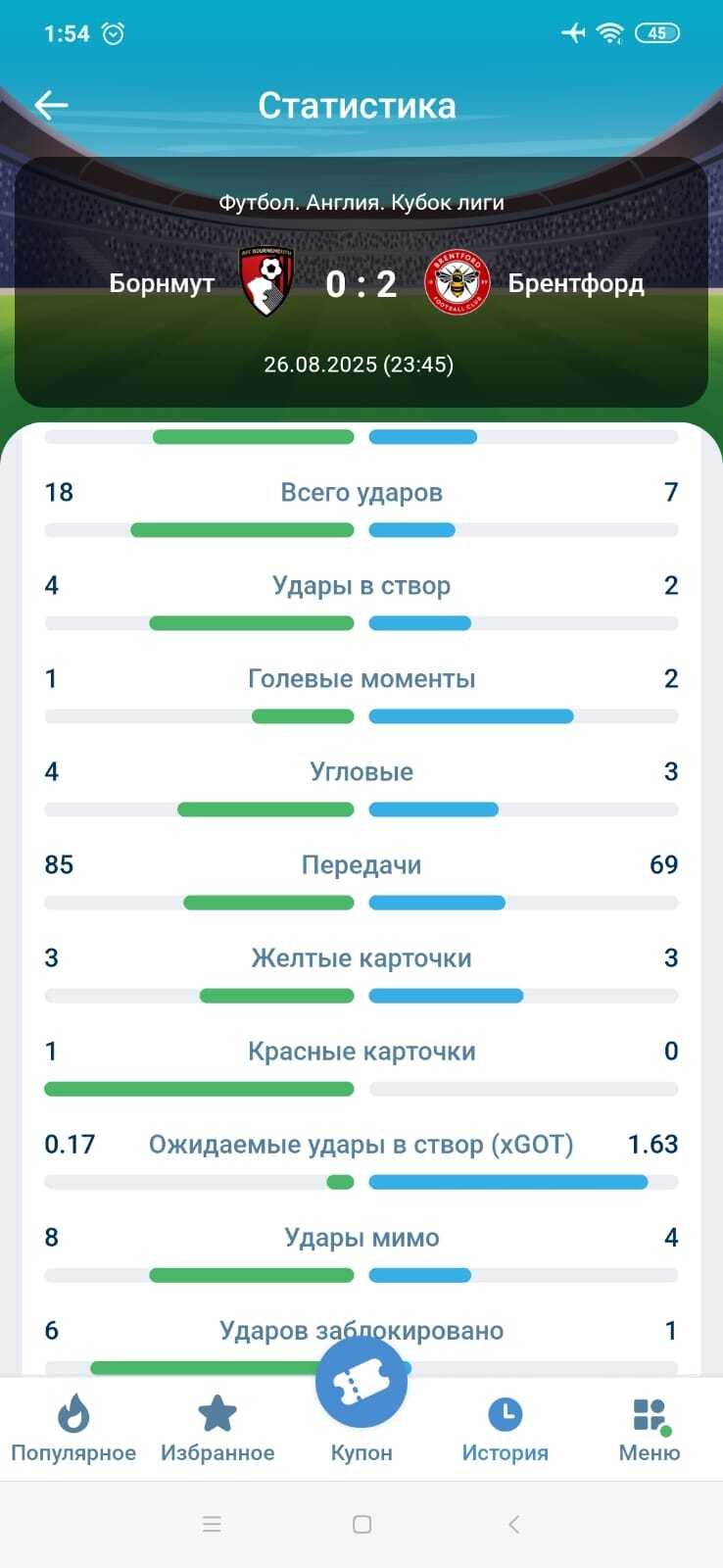 Здравствуйте помогите пожалуйста восстановить спрведливость. матч футбольной английской лиги между борнмутом и брендфордом поставил на тотал ударов по воротам 24.5 больше. в результатах у них указывается счет 18:7 но они долго не расчитывали. спустя почти 4 часа после матча выходит проигрыш со счетом 18:6. на flasscorekz и счет 18:7 я начал сравнивать судя по всему они не посчитали один заблокированный удар брендтфорда. пишу им они просят официальный источник. помогите пожалуйста найти официальный источник этого матча. получается они сами без официального источника где то подсмотрели и исправили счет.