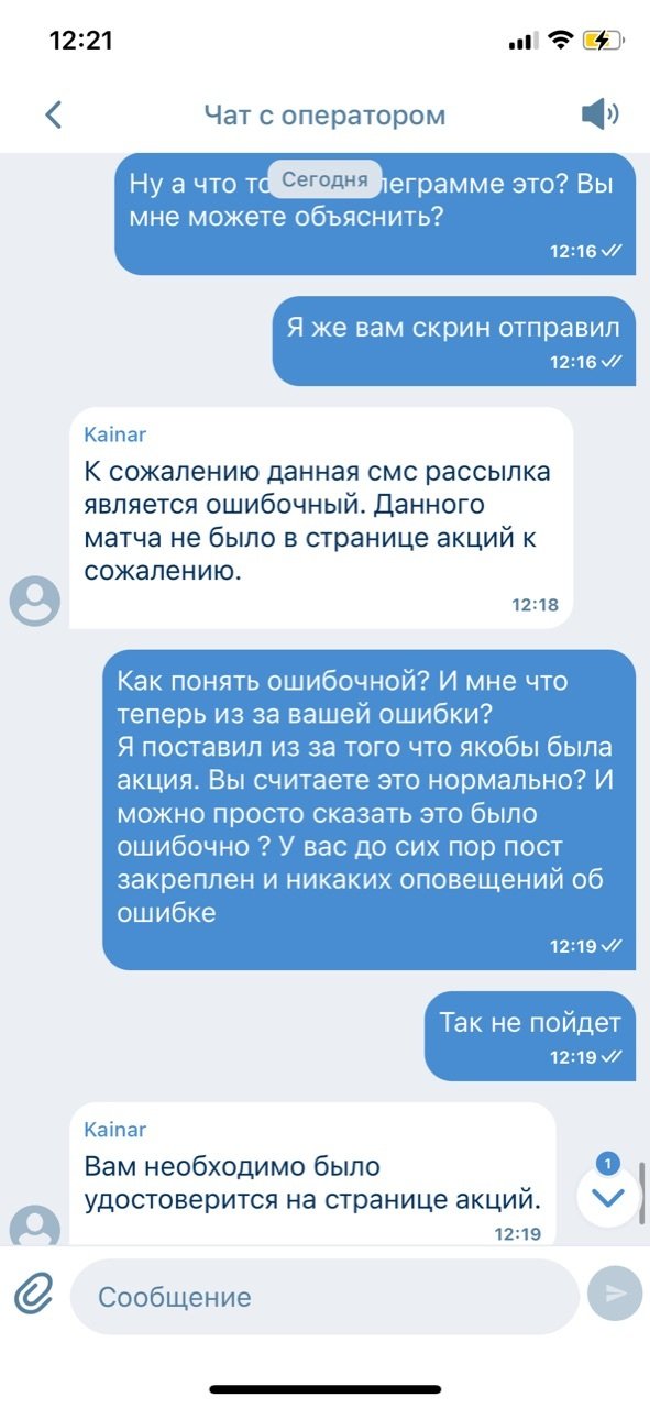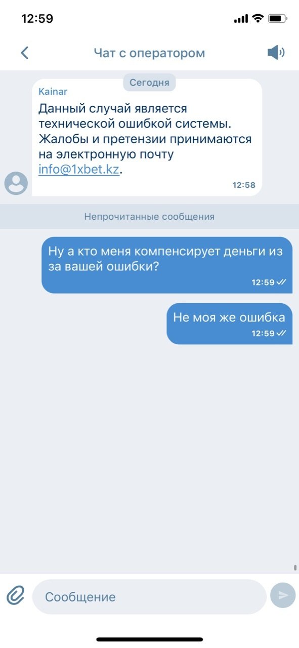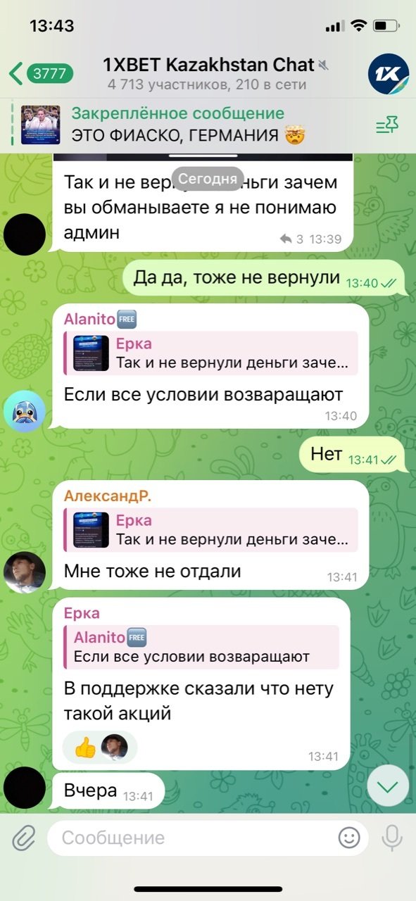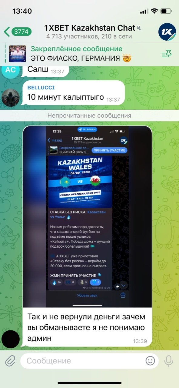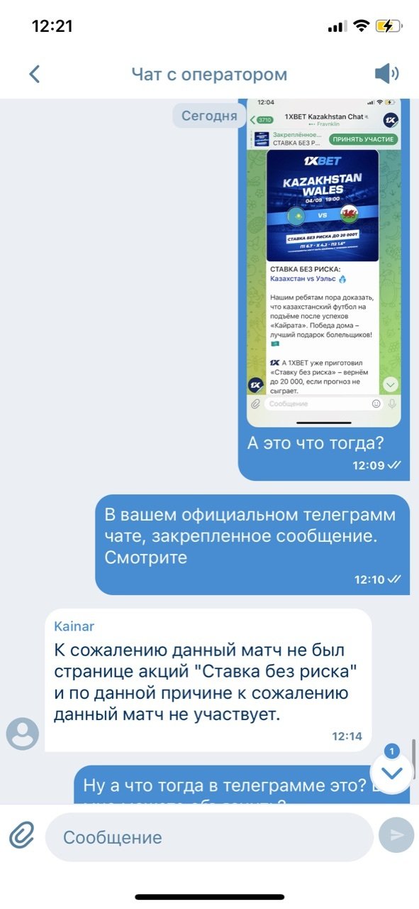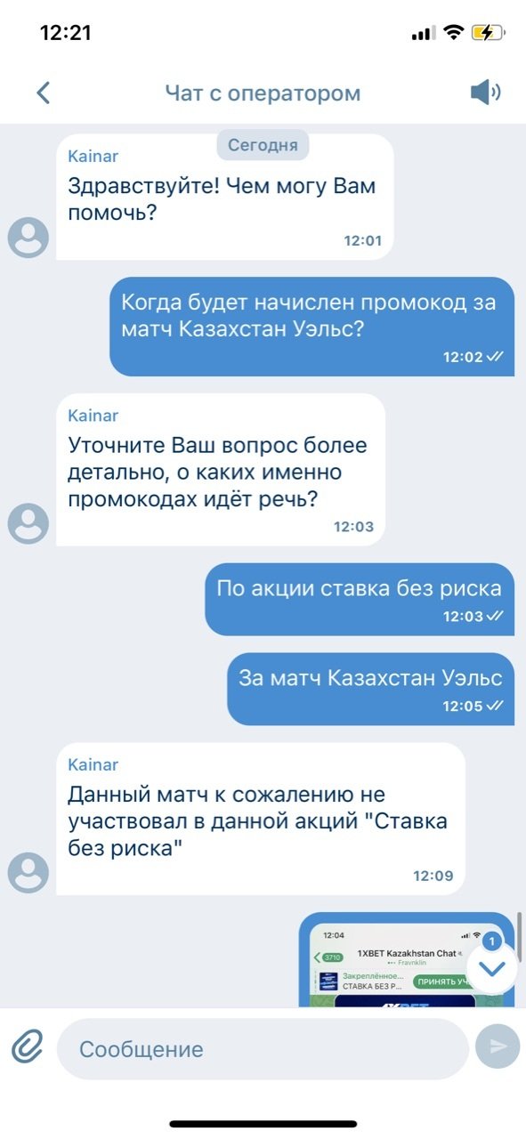 Уважаемые господа,Хочу подать жалобу на действия букмекерской конторы 1xBet KZ, которые считаю вводящими в заблуждение и нарушающими права игроков.В официальном телеграм-канале и чате конторы была анонсирована акция «Ставка без риска» на матч Казахстан – Уэльс (скриншот прилагаю). Ссылка на пост на канале: . Условия акции были стандартные: при ставке до 20 000 тг на исход П1/Х/П2, в случае проигрыша ставка компенсируется промокодом на следующий день.Я поставил именно на этот матч, так как в официальных источниках букмекера была опубликована информация об участии игры в акции. Моя ставка не сыграла, однако промокод я не получил.Обратившись в чат поддержки приложения 1xBet, я получил ответ, что данный матч якобы не участвовал в акции, и что необходимо было проверять условия на странице акции в приложении. Считаю это объяснение неприемлемым, так как акция была официально анонсирована в телеграм-канале компании, что подтверждается скриншотом.В телеграм-чате букмекера множество пользователей также жаловались на то, что поставили на этот матч, доверившись официальному анонсу.Таким образом, действия 1xBet KZ можно квалифицировать как введение игроков в заблуждение и обман, что нарушает мои права как клиента.Прошу:Провести проверку действий букмекерской конторы 1xBet KZ.Обязать компанию выполнить условия акции и компенсировать проигрыш в виде промокода, как это было анонсировано.Принять меры к недопущению подобных нарушений в дальнейшем.К жалобе прилагаю скриншот из официального телеграм-канала букмекера с анонсом акции.