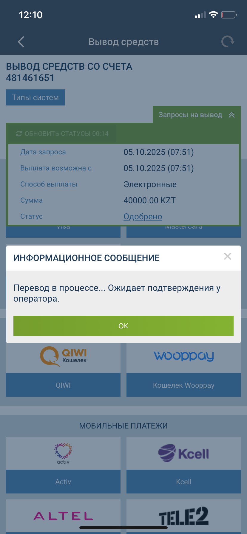 Я сделала вывод средств вчера в 10 часов утра через сервис халык банкомат в бк 1хбет однако на сегодняшний день и на момент подачи жалобы деньги все ещё не поступила на счёт хотя колл центр и пожержка уверяли что средства поступить обратно на счёт в тчений 28 часов, вот уже 28 часов прошла а деньги не вернули на счёт и не пришёл смс с кодом для вывод средств. Прошу разобраться и оперативно вернуть деньги обратно на счёт