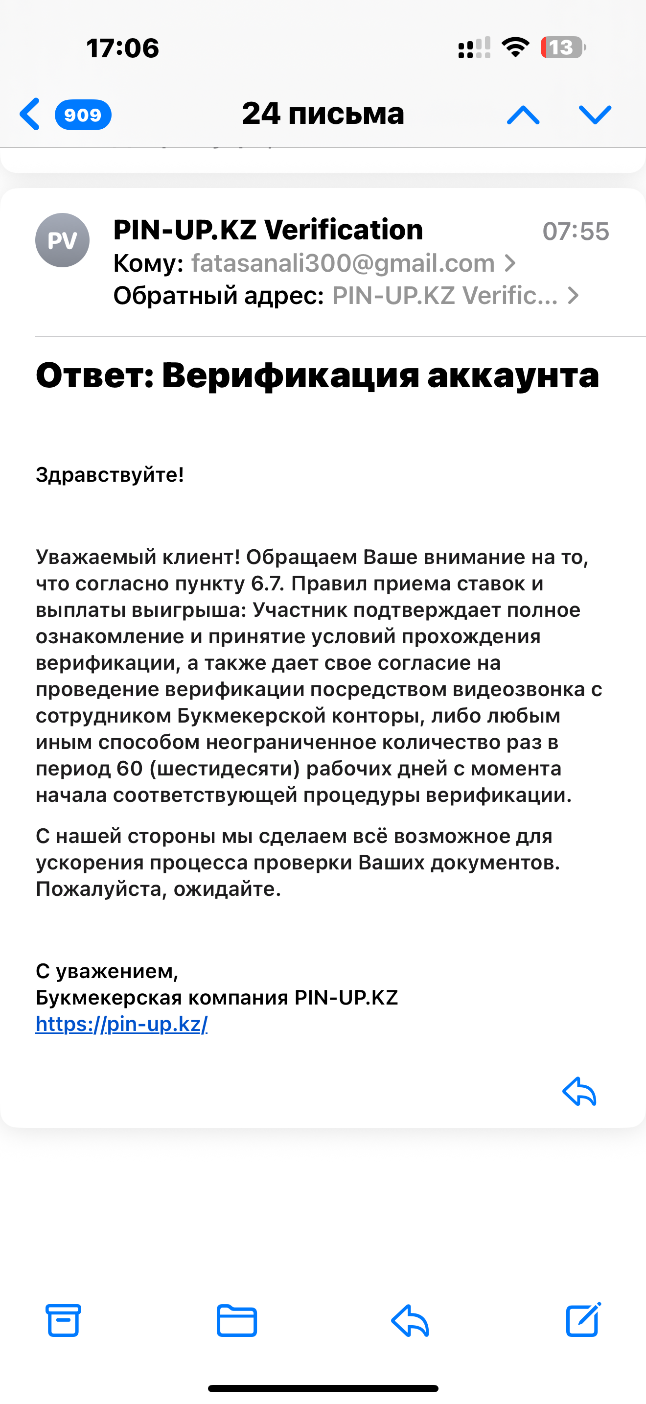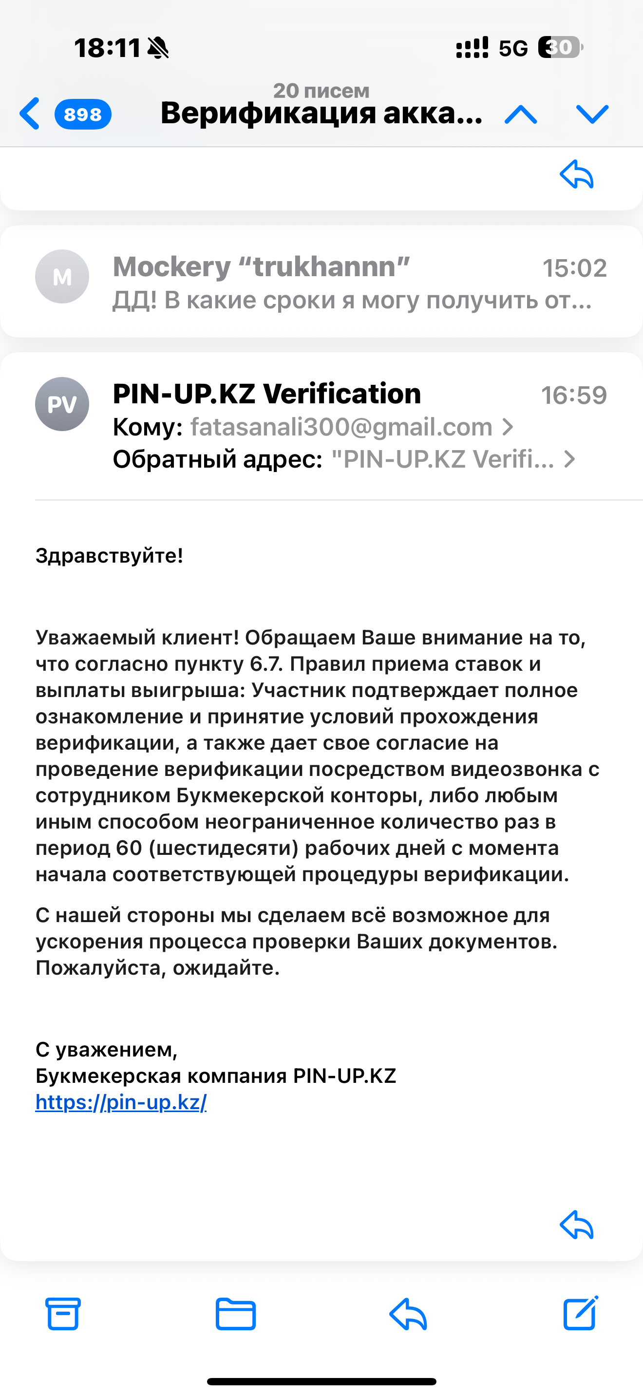 Я совершил более 300 пари в этой конторе, и БК чередовал выигрыши и проигрыши, и вот когда моя «лесенка» начала приносить суммы, а ставлю я в 8/10 на ТМ Баскетбол, реже на Теннис.И в какой то момент, когда я хотел вывести деньги, которые мне нужны, вывод был заблокирован - попросили привязать почту, я подумал: «Ну, пустяки сейчас привяжу и выведу». Как же я ошибался, меня начали футболить с дополнительной видео-верификацией, которая у них очень плохо работает, мне ставили ее ТРИ раза и ТРИ раза, и в течении этих ТРЕХ видео-верификации мне задавали 1 вопрос, и не переходили к следующему, хотя я отвечал четко и коротко, вопрос был: «На какой почте привязан ваш аккаунт?».Поддержка в приложении и в телеграмме, отнекивалась, говоря, что верификация вопрос не их юрисдикции. И вот в третий раз, когда я прислал им очередное видео доказательство, того что их видео-верификация сломана, они не отвечают порядка 2-3 суток, хотя должны отвечать в пределах 24 часов. Прошу как то помочь решить с этим беспределом, ведь мои деньги заморозили и не помогают решить, я пользовался другими БК, а выбрал Пинап из-за высоких коэффициентов и широкой линии, но кто же знал, что будет такая подляна. Я писал, что готов пройти любые проверки, чтобы мне дали вывести эти деньги, но все мимо. Надеюсь, на обратную связь.