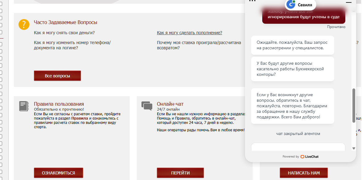 Здравствуйте, команда Legalbet. Обращаюсь с жалобой на действия букмекера ТОО «OLIMPBET KZ». Уже более трёх месяцев букмекер игнорирует мои обращения и не предоставляет запрашиваемую информацию по моему игровому счёту. Я неоднократно писал в службу поддержки через официальный сайт и чат. Каждый раз операторы отвечают, что “свяжутся со мной через 30–40 минут”, однако после этого просто пропадают — ответа так и нет. Кроме того, букмекер отказывается предоставить историю ставок, пополнений и выводов, что является прямым нарушением моих прав как клиента и потребителя. Помимо этого, я обращался с требованием вернуть проигранные средства, так как на момент совершения ставок я находился в реестре должников, а букмекер, согласно законодательству, не имел права принимать у меня ставки. Однако вместо рассмотрения обращения компания фактически уклоняется от диалога и не предпринимает никаких действий. Прошу Legalbet оказать содействие в разбирательстве и повлиять на букмекера для: Предоставления полной истории моего игрового счёта (ставки, пополнения, выводы). Рассмотрения вопроса о возврате средств, принятых незаконно. Прекращения практики игнорирования обращений клиентов.