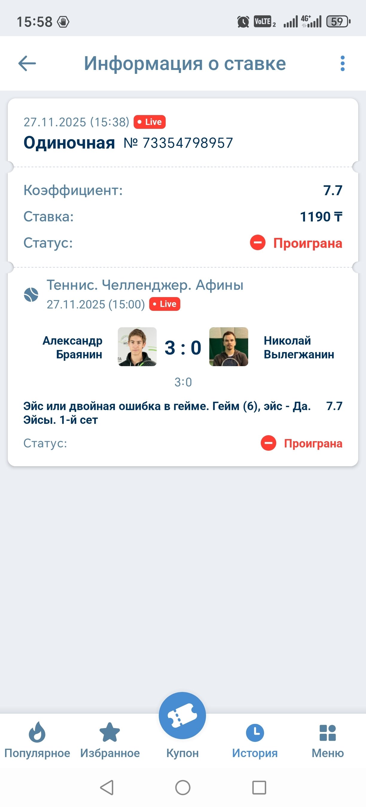 Здр. Ном. Купона 73354798957 ставка пригрыш, я сам не понел почему там написанно эйс или двойная ошибка в 6 гейме.Именна на 6 гейме было допущенно двойная ошибка подающим игроком но ставка приогрыш помогите пожалуйста спасибо за ранее