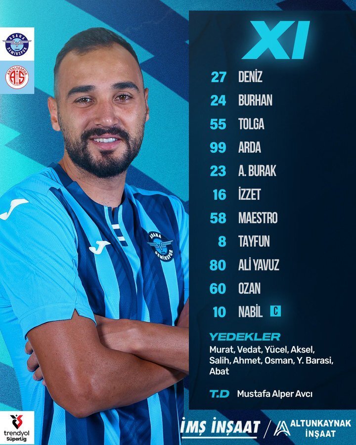 Форвард сборной Казахстана Абат Аймбетов не попал в стартовый состав «Адана Демирспор» на домашний матч 24-го тура турецкой Суперлиги против «Антальяспора».