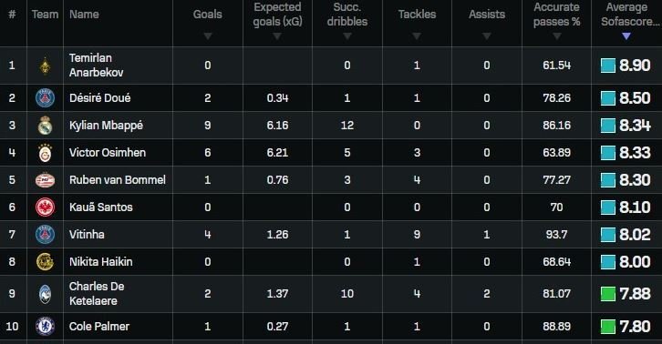 Анарбеков занимает первую строчку топа с оценкой 8,90. Вторую позицию занимает вингер «ПСЖ» Дезери Дуэ — 8,50, а третью — нападающий мадридского «Реала» Килиан Мбаппе — 8,33.