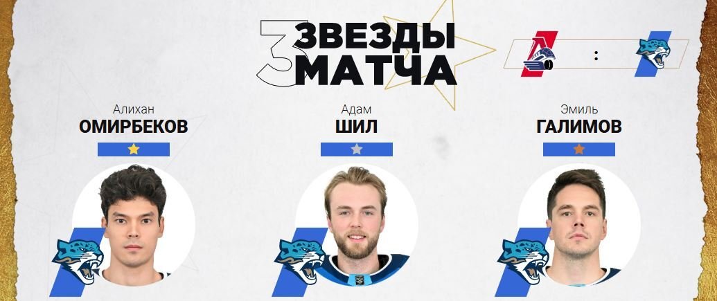 Первой звездой матча стал Алихан Омирбеков (забил гол), второй звездой признан Адам Шил (отразил все броски), а третьим выбрали Эмиля Галимова (набрал 1+1).