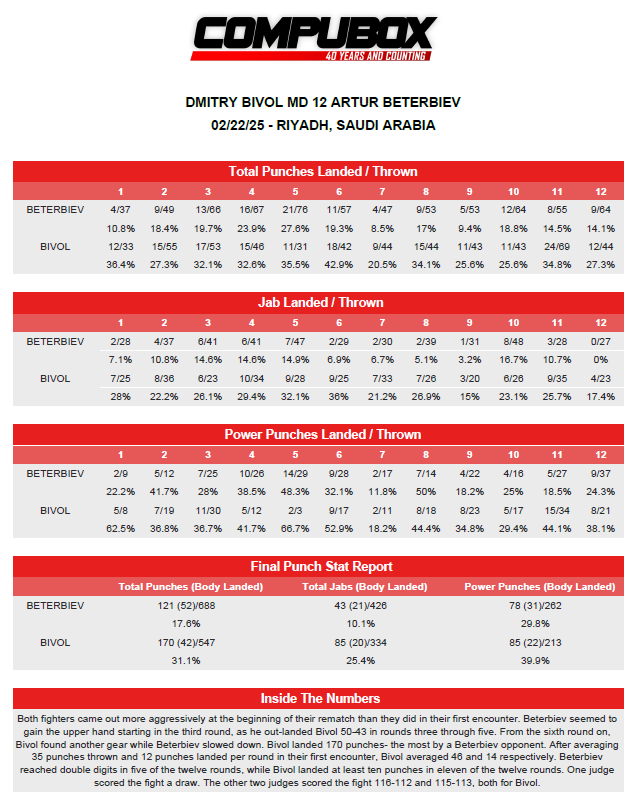 Стала известна статистика титульного боя-реванша за звание абсолютного чемпиона мира в полутяжёлом весе между россиянином Дмитрием Биволом (24-1, 12 KO) и канадско-российским боксёром Артуром Бетербиевым (21-1, 20 KO).