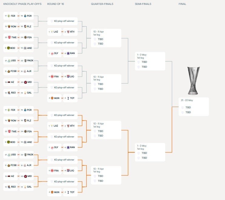 Жеребьёвка следующих стадий состоится 21 февраля. Финал Лиги Европы состоится в Бильбао 21 мая.