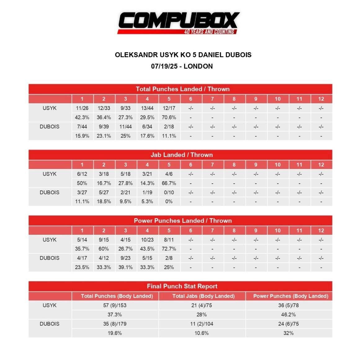 Статистика за пять раундов боя: Усик точно нанёс 57 ударов из 153 (точность 37,3%), Дюбуа — 36 ударов из 179 (точность 19,6%). Кроме того, украинец превзошёл британца в точности джебов и силовых ударов.